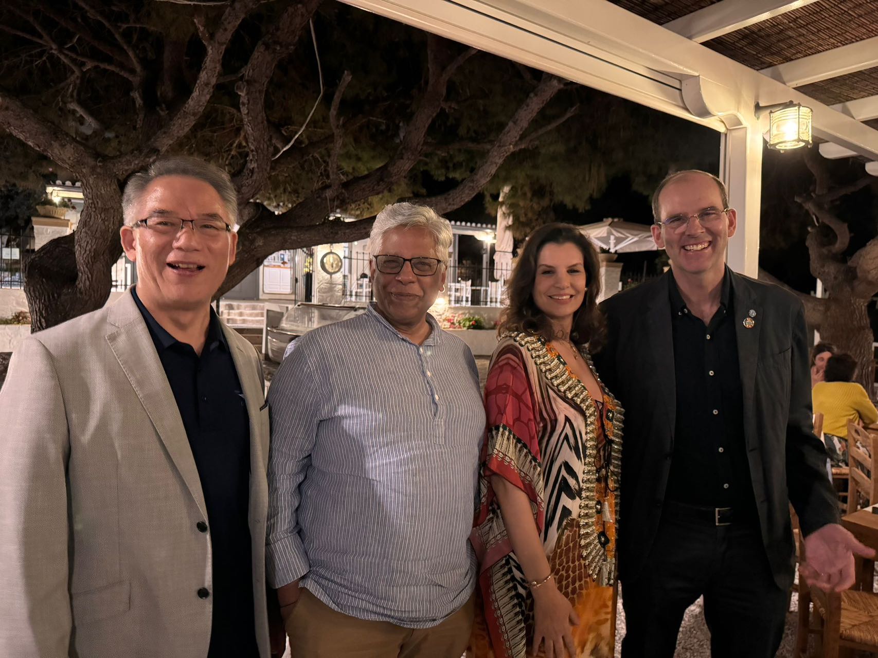 图4 在联合国秘书长海洋事务特使Peter Thomson举行招待会上,焦念志院士与法国总统联合国海洋大会特使Olivier Poivre d'Arvor、蓝色季节(Saison Bleue)基金会负责人Rym Benzina和海洋竞赛(Ocean Race)主席Richard Brisius 交流