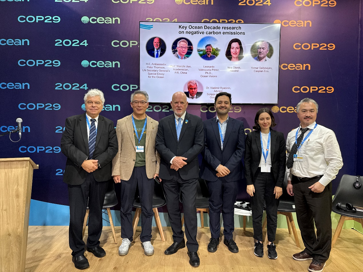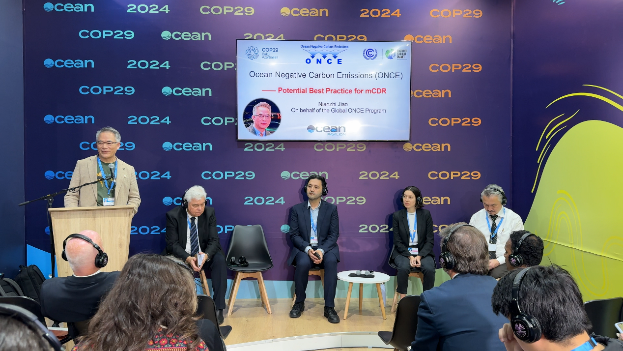 阿塞拜疆时间2024年11月19日下午,“海洋十年”负排放前沿研究边会在《联合国气候变化框架公约》第29次缔约方大会(COP29)蓝区海洋角成功举办。会议由海洋负排放国际大科学计划(Global ONCE)主办,联合国秘书长海洋特使彼得·汤姆森(Peter Thomson)致开幕辞,联合国教科文组织政府间海洋学委员会前执行秘书长、斯克里普斯海洋研究所顾问弗拉基米尔·里亚比宁(Vladimir Ryabinin)主持。海洋负排放国际大科学计划首席科学家焦念志,美国海洋愿景研究中心(Ocean Visions)国际合作主任莱昂纳多·巴伦苏埃拉·佩雷斯(Leonardo Valenzuela Pérez),瑞万德研究中心(Rewind)可持续发展高级官员诺亚·奥莱尼克(Noa Olenik),以及里海环境协会(Caspian Environmental Consortium Ltd.)首席执行官叶尔纳·赛利巴耶夫(Yernar Sailybayev)出席并发表专题报告。