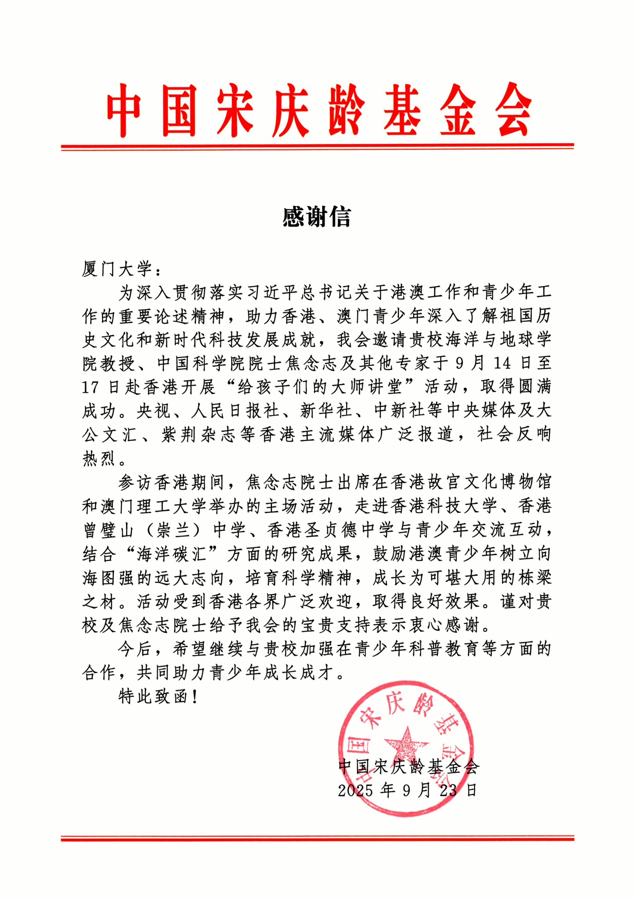 此次科普活动的成效与价值也得到了活动主办方中国宋庆龄基金会的认可。9月23日,基金会特意向厦门大学致送感谢信,感谢焦念志院士在港澳科普工作中结合 “海洋碳汇” 研究成果开展的交流互动,有效助力港澳青少年树立向海图强志向、培育科学精神,也提及此次系列活动因贴合青少年需求、传递前沿科技知识,在港澳社会收获广泛好评,为未来双方进一步深化青少年科普教育合作、持续推动港澳与内地科技文化交融搭建了良好桥梁。