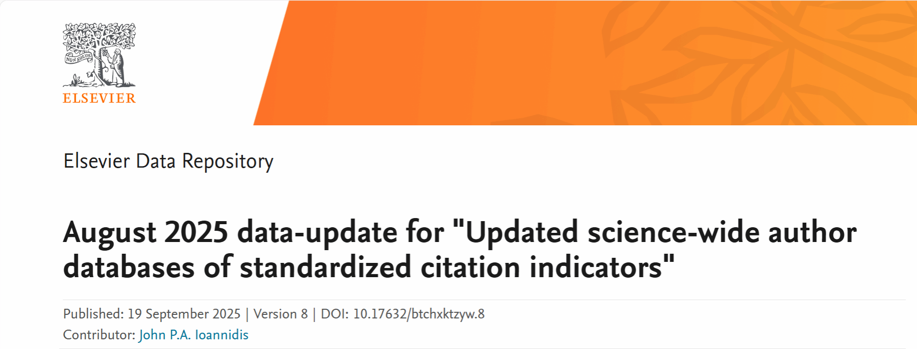 相关链接:August 2025 data-update for "Updated science-wide author databases of standardized citation indicators" - Elsevier BV