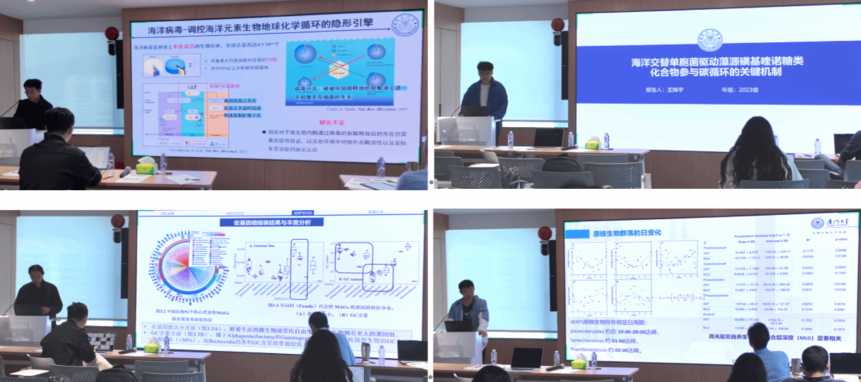 颁奖仪式后,研究生开题汇报与学术分享依次开展。同学们围绕各自研究方向逐一汇报,内容涵盖造礁珊瑚病毒与碳循环、海水碱度增汇机制、藻菌共生体碳汇过程、原生生物碳循环调控、污水碱化排海增汇、陆海统筹微藻固碳等多个前沿方向,覆盖从微生物机理到应用的全链条研究。现场同学们积极参与提问与讨论,汤凯、胡安谊、夏晓敏、朱陈霸、孟雅冰、胡晨、肖喜林等与会老师结合每位同学的研究内容逐一给出针对性点评与指导,交流氛围热烈,同学们在研究设计、实验方法与科研思路上都有实实在在的收获。
