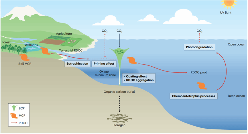 论文简介:众多研究已经证实了惰性溶解有机碳(RDOC)的形成是通过微生物转化溶解有机碳(DOC)实现的,涉及了包括异养、自养微生物活动和病毒作用在内的多种微生物过程。本研究详尽讨论了RDOC的空间分布特征、分子构成的精细划分,以及RDOC复杂性与微生物多样性之间的深层联系;深入探讨了微型生物碳泵(MCP)在地质历史上对碳循环和气候调控的复杂作用,以及海洋中三个关键碳泵系统MCP、生物泵(BCP)、碳酸盐泵(CCP)的相互作用。本研究揭示了以MCP为核心的海洋碳循环过程在应对全球气候变化中扮演的重要角色。不仅突显了海洋碳循环对抗气候变化过程中未被充分认识的潜力,也展现出了海洋生态与全球碳循环相互织就的复杂网络。桥接了微观生态过程与全球碳循环的宏观影响,以及长周期尺度下气候变化与MCP之间的关联。而提出的BCMS策略(BCMS: BCP-CCP-MCP-SCP),前瞻性的开辟了优化海洋负碳排放的新途径。这项研究不仅扩展了对地球化学系统微生物与有机碳之间深层次行为的理解,也为未来海洋碳中和与气候变化缓解提供了实用的思路与策略。