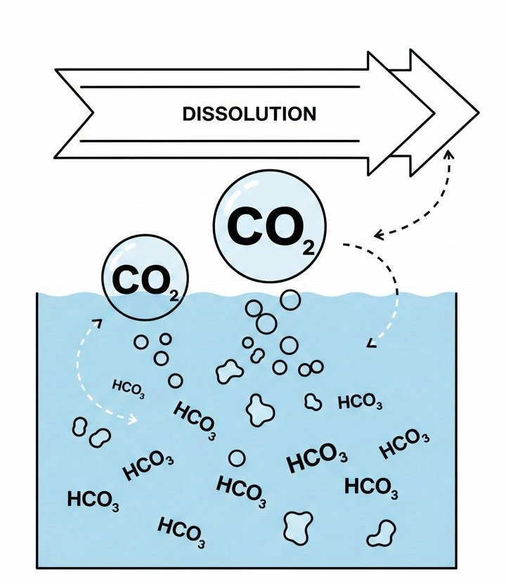 第一步:碱性材料溶解在水中,提升水体的“碱度”(Alkalinity)。